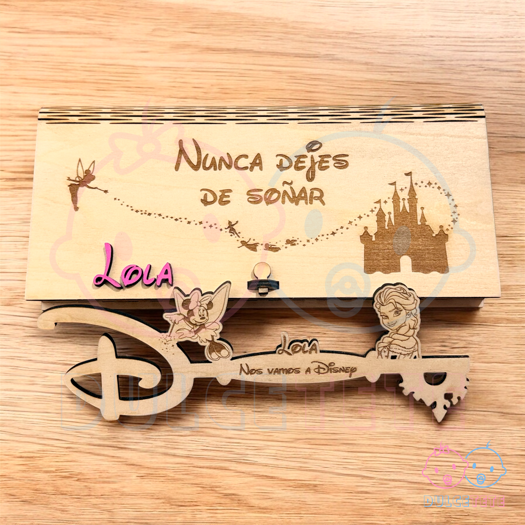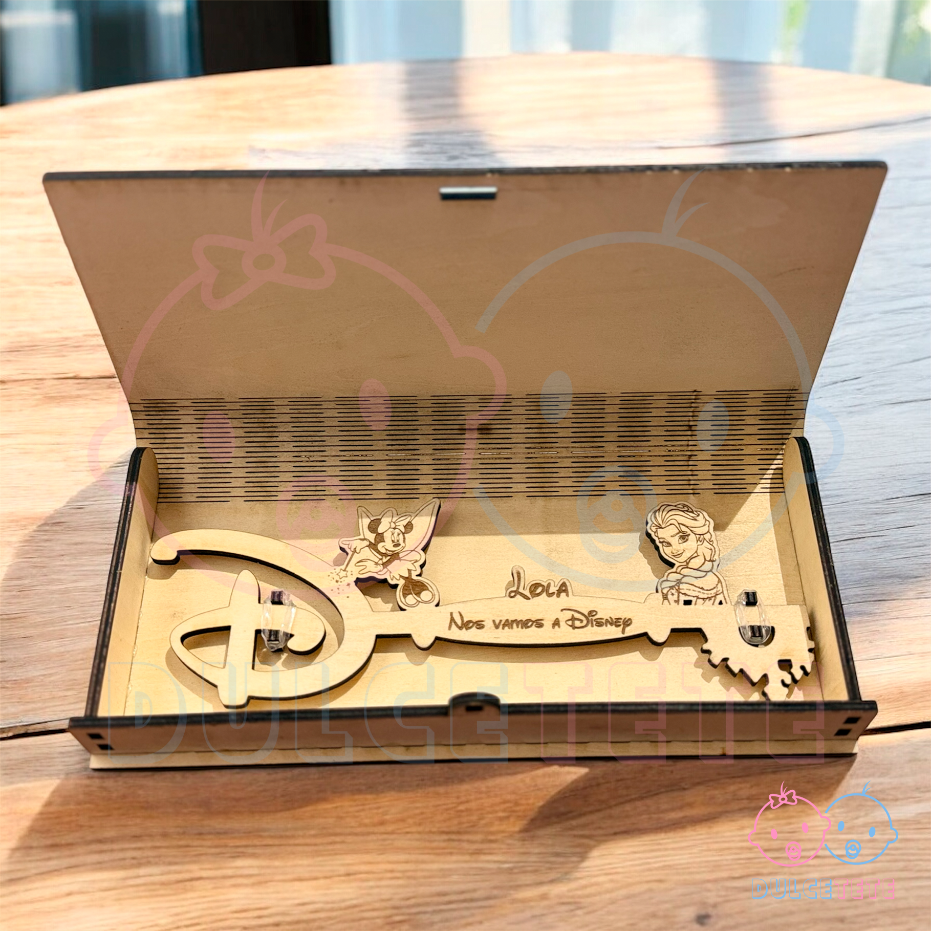 Nuestra caja Disney con llave personalizada, de delicado diseño estilo libro, está elaborada en madera y cortada a láser con gran precisión, cuidando cada detalle para lograr un acabado elegante y lleno de encanto.